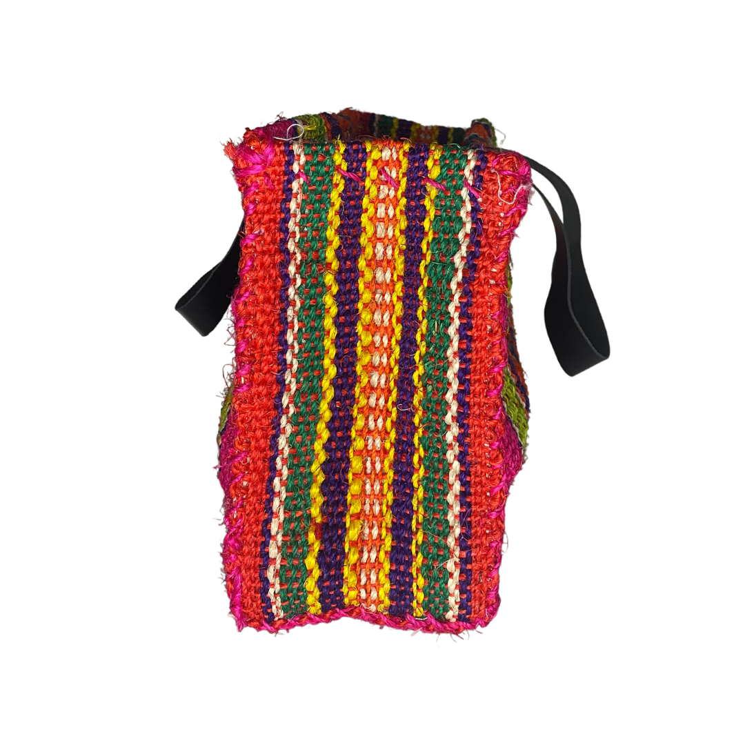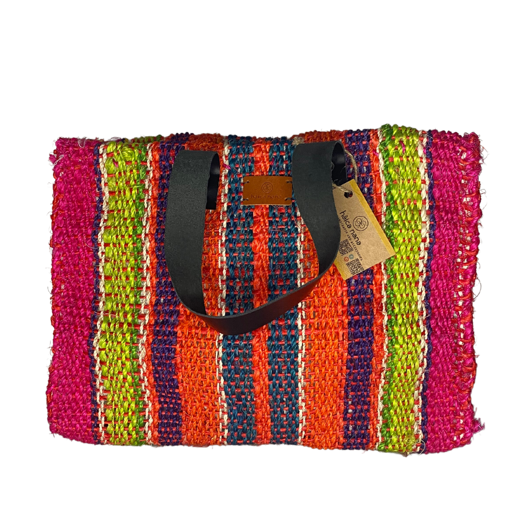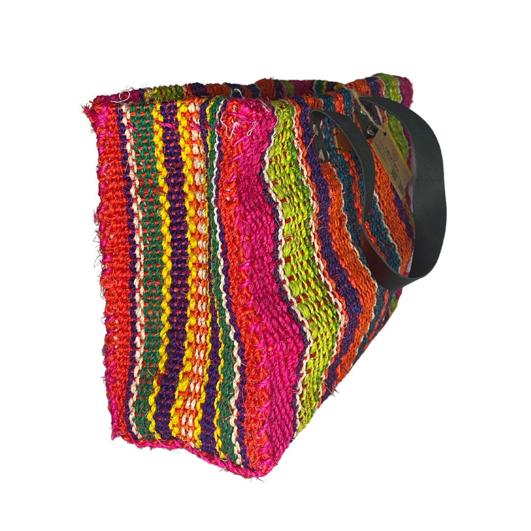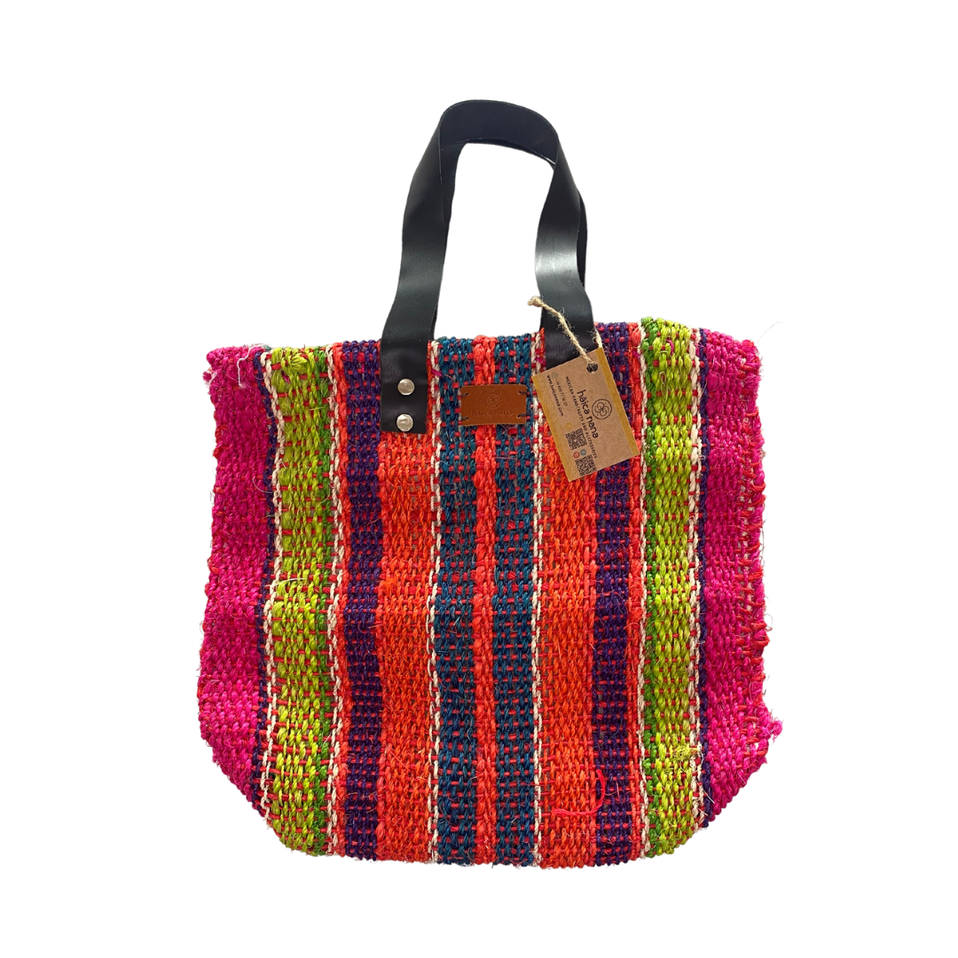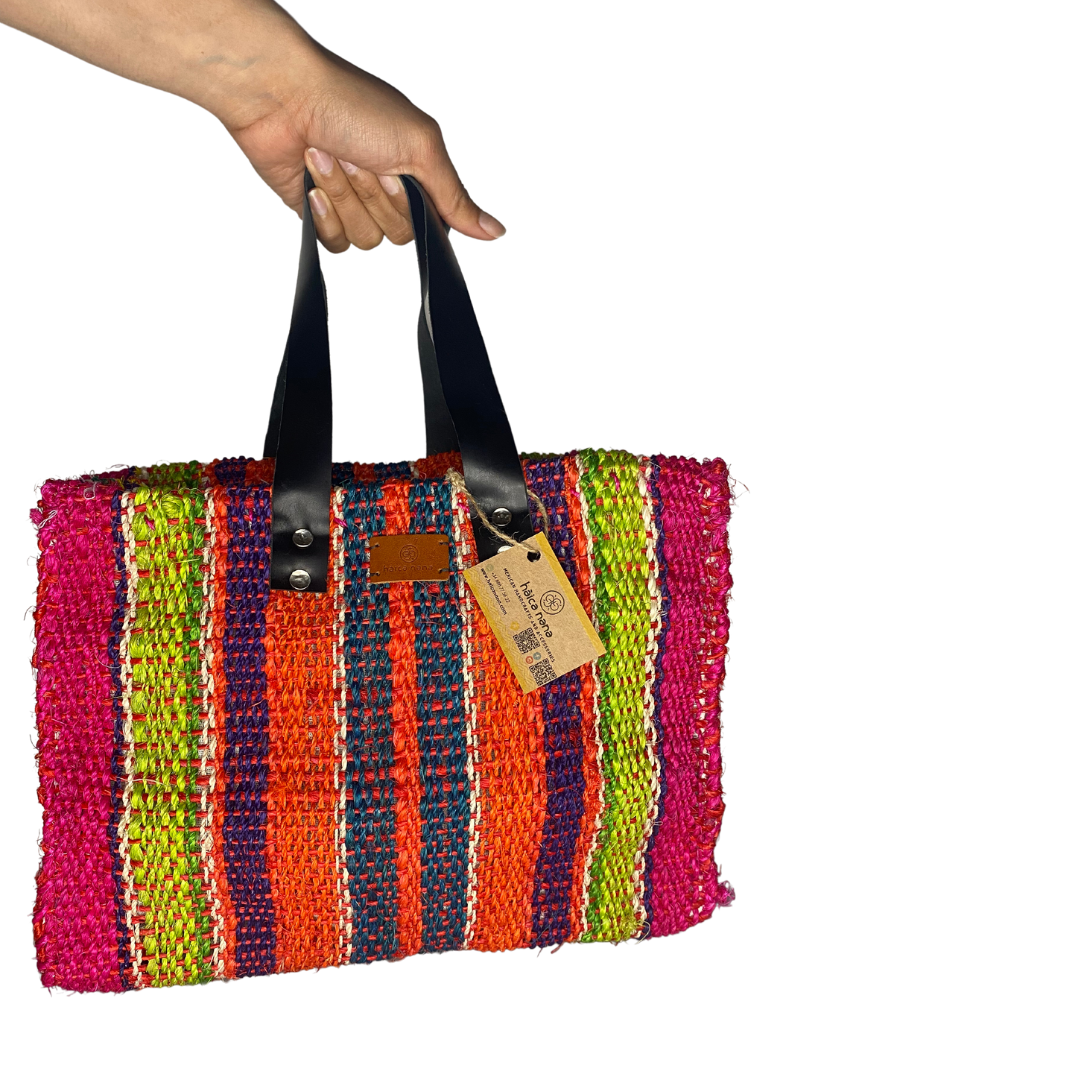La medida del bolso es de 30 x 30 cm. El bolso en su interior tiene forro de tela, y para un agarre más cómodo tiene asas de cuero.