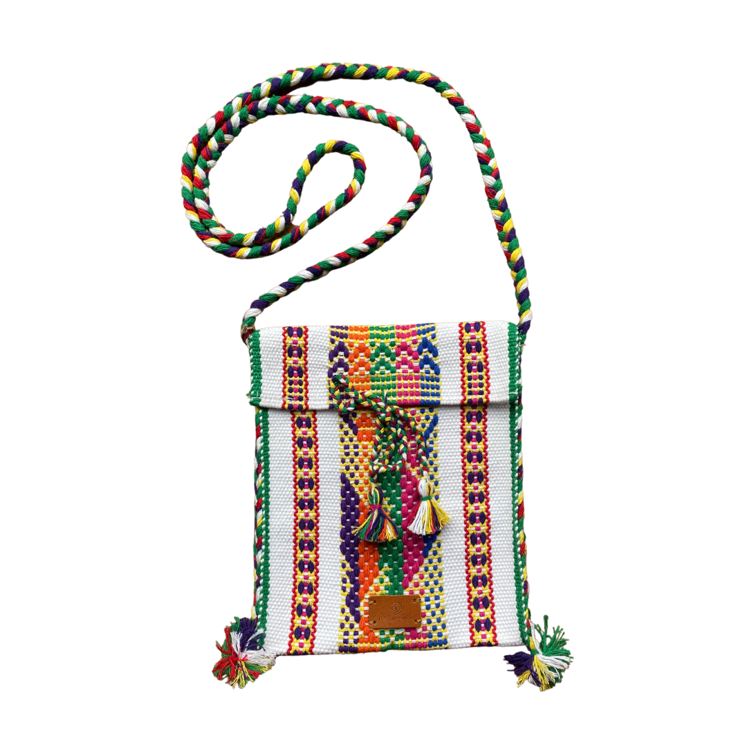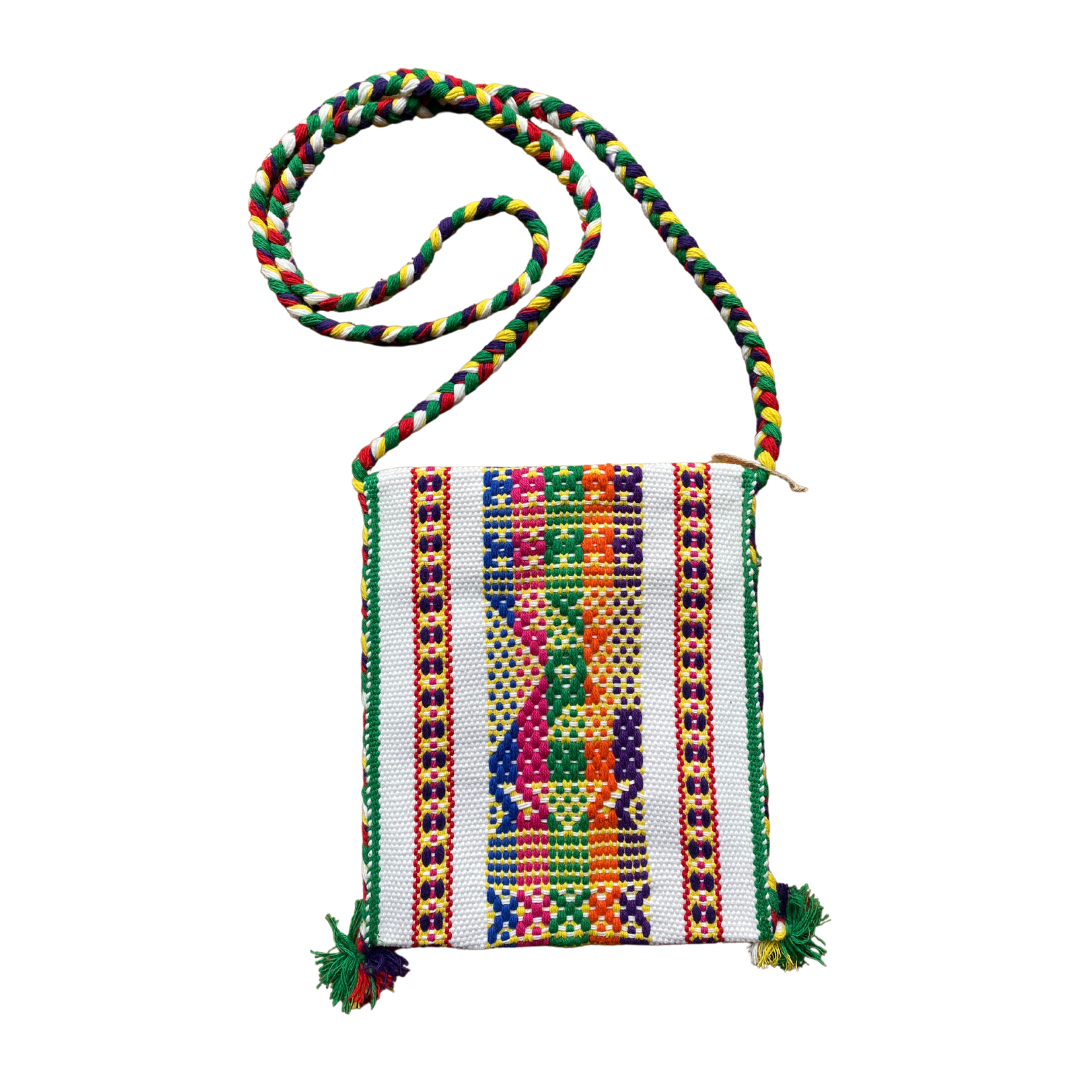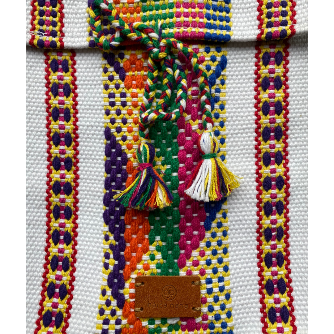 Realizado artesanalmente con hilos de algodón en telar de cintura en los Valles Centrales del estado de Oaxaca, México por la artesana Margarita Mendoza.