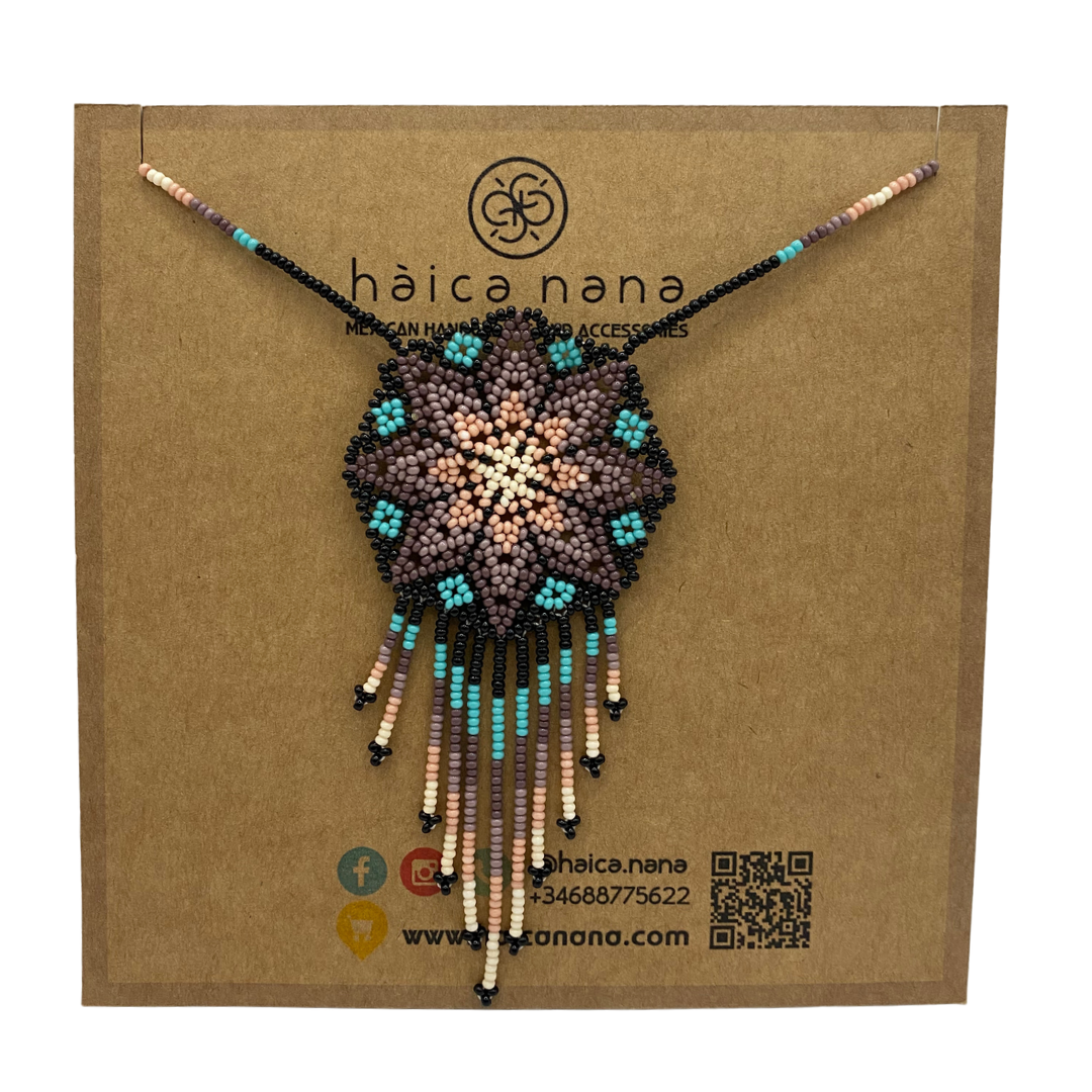 Collar artesanal hecho a mano por artesanas de la comunidad Wixárika en México.