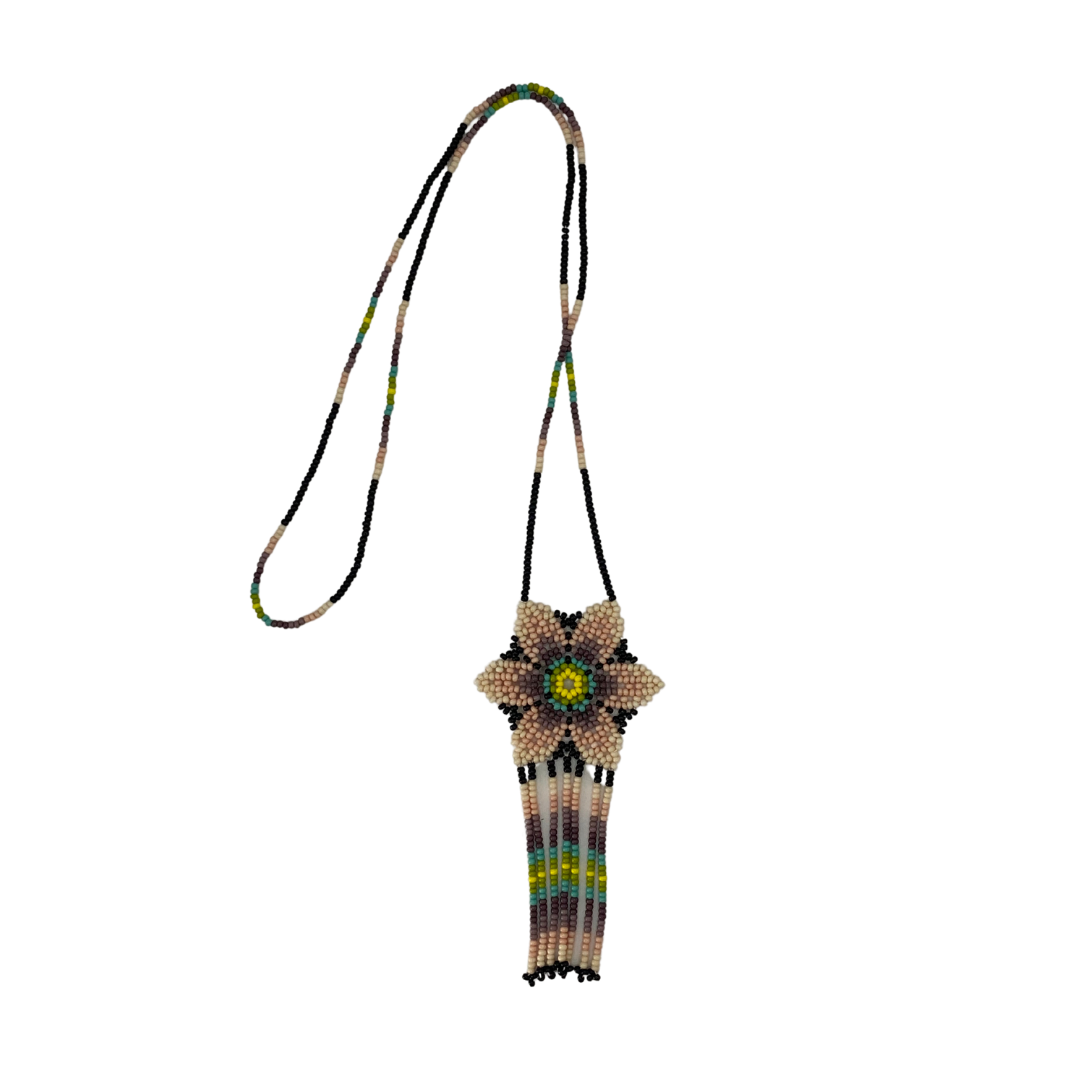 La figura representada en el collar es la flor de peyote, el cual es una cactácea originaria de México, perteneciente a la región donde esta comunidad habita. El peyote tiene efectos psicoactivos y lo usan para sus ceremonias, al consumirlo crean una conexión que ayuda a sanar el alma y limpiar el espíritu.