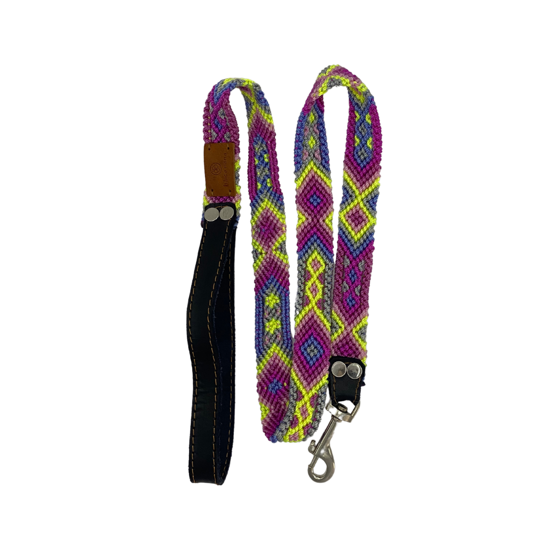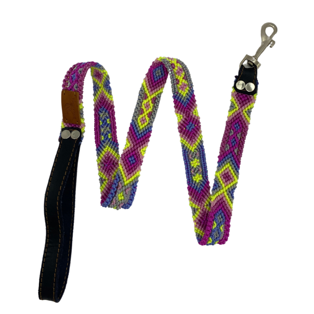 Apapacha a tu mascota con esta bonita correa, cada pieza muestra la esencia y el esfuerzo del artesano. Cada tejedora plasma a través de sus diseños lo aprendido por generaciones. Vierten en ellos parte de su cultura y tradiciones, ellas escogen las combinaciones de colores y patrones, por lo cual cada correa es única, divertida y con significado.