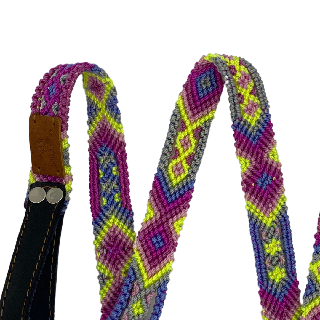 Correa trenzada a mano con hilo de nylon y detalles en cuero, realizadas por miembros de la comunidad Tzotzil de Chiapas, México.