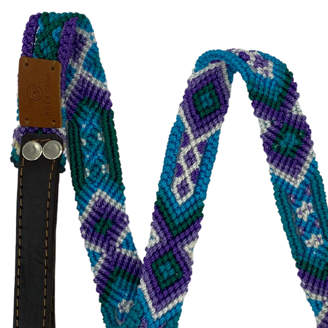 Correa trenzada a mano con hilo de nylon y detalles en cuero, realizadas por miembros de la comunidad Tzotzil de Chiapas, México.