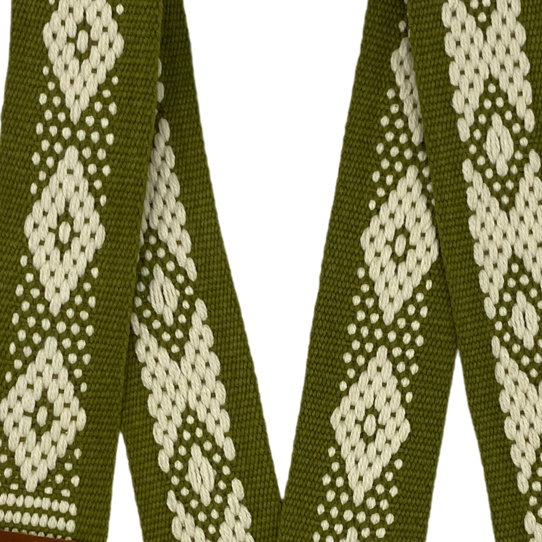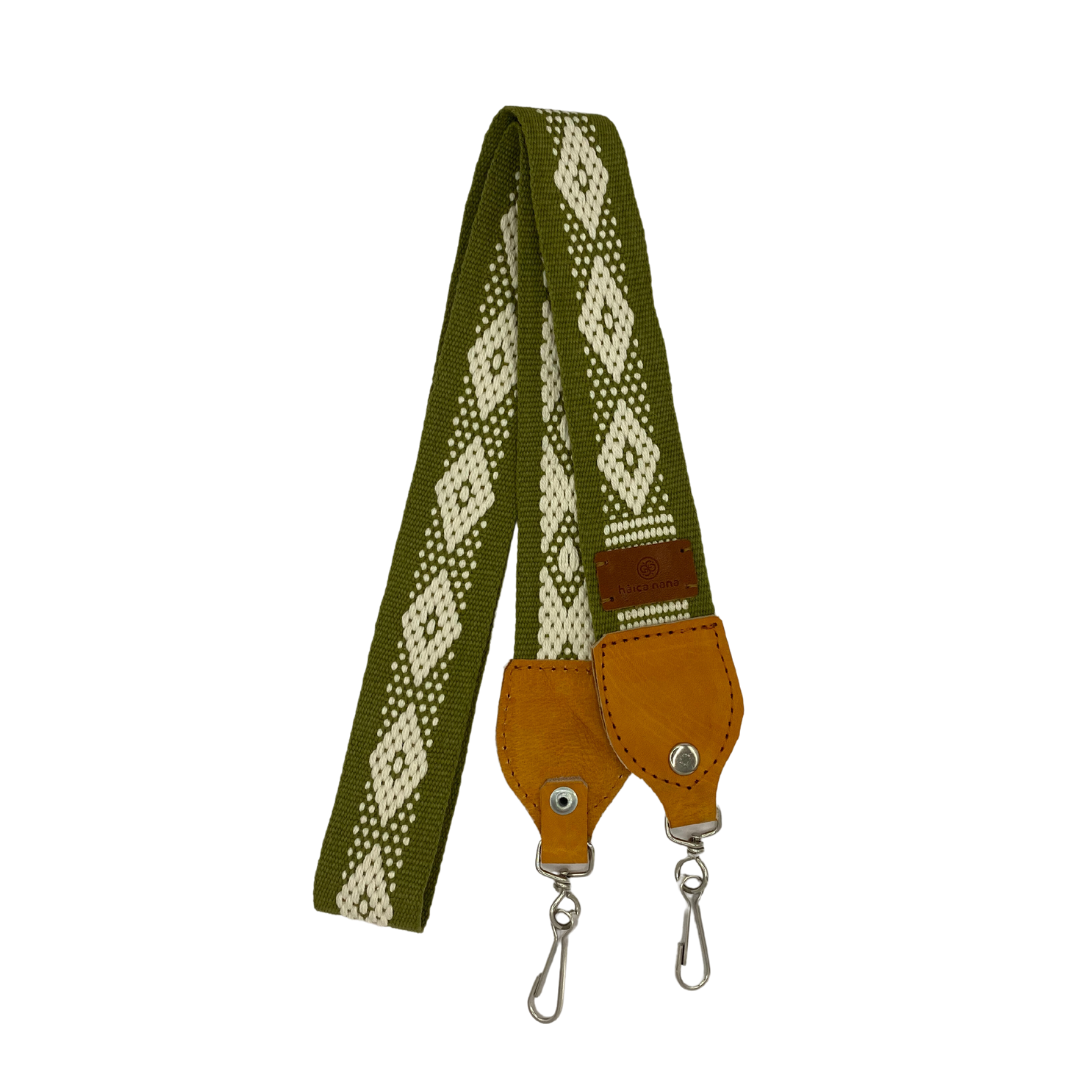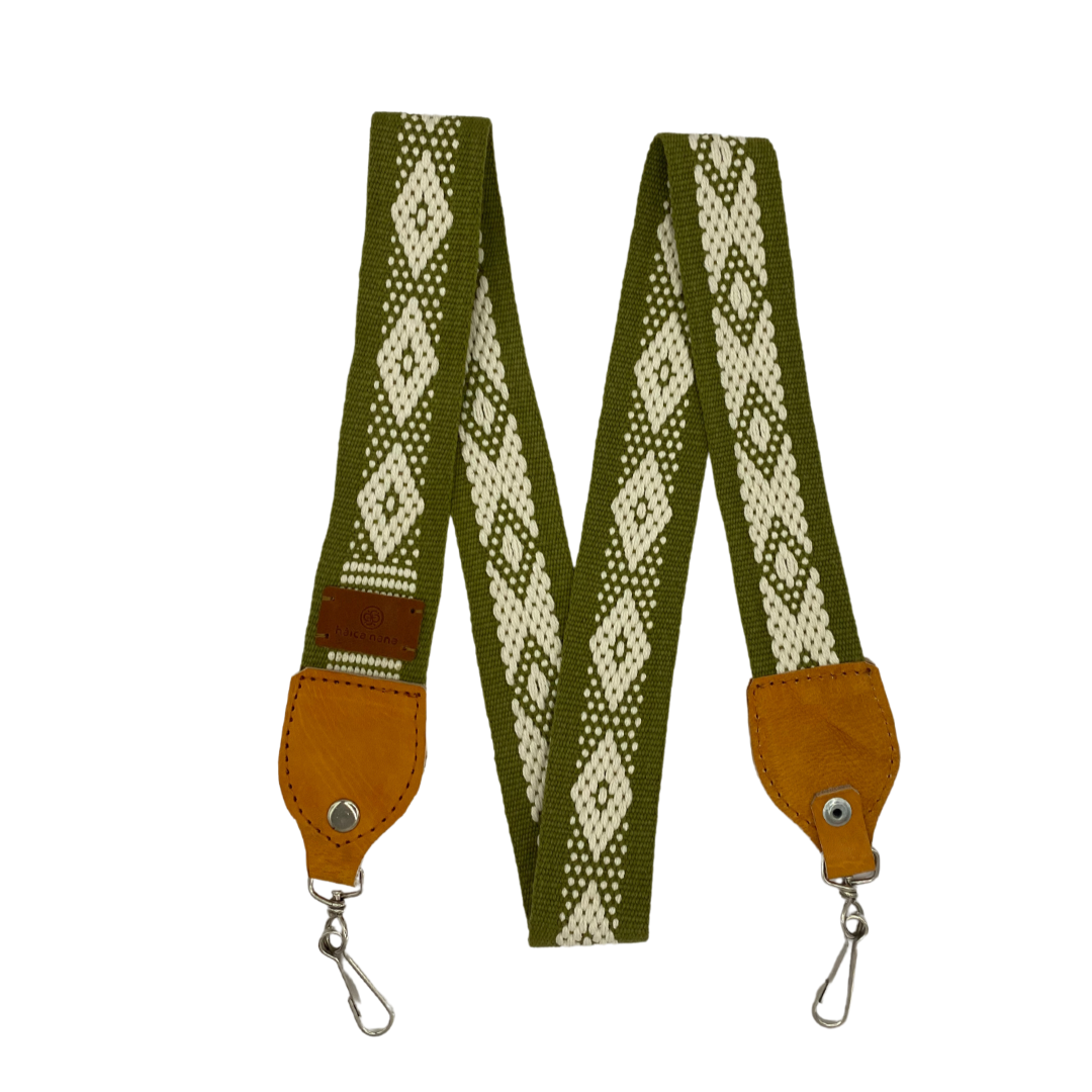 Correa hecha a mano con la técnica de telar de cintura con hilo de algodón y detalles en cuero, realizadas en Santo Tomás Jalieza, Oaxaca, México, por Margarita Mendoza.