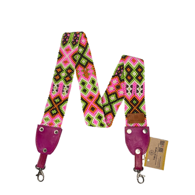 Correa trenzada a mano con hilo de nylon y detalles en cuero, realizadas por miembros de la comunidad Tzotzil de Chiapas, México.