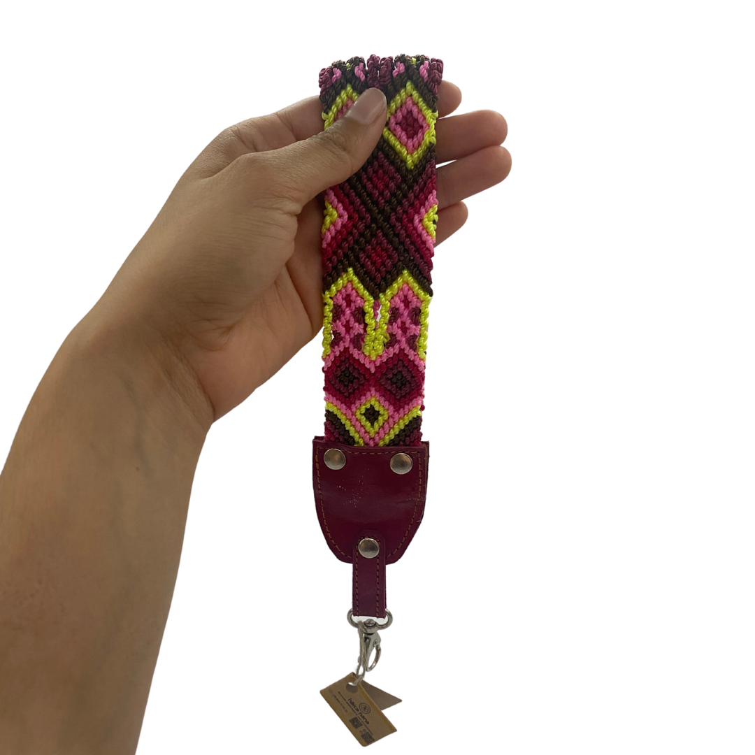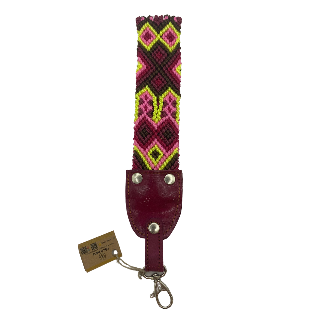 Este accesorio es ideal para llevarlo de llavero que facilita el encontrar las llaves, también puede ser utilizado como correa de mano para bolso pequeño. realizado por artesanas de la comunidad Tzotzil en Chiapas, México.