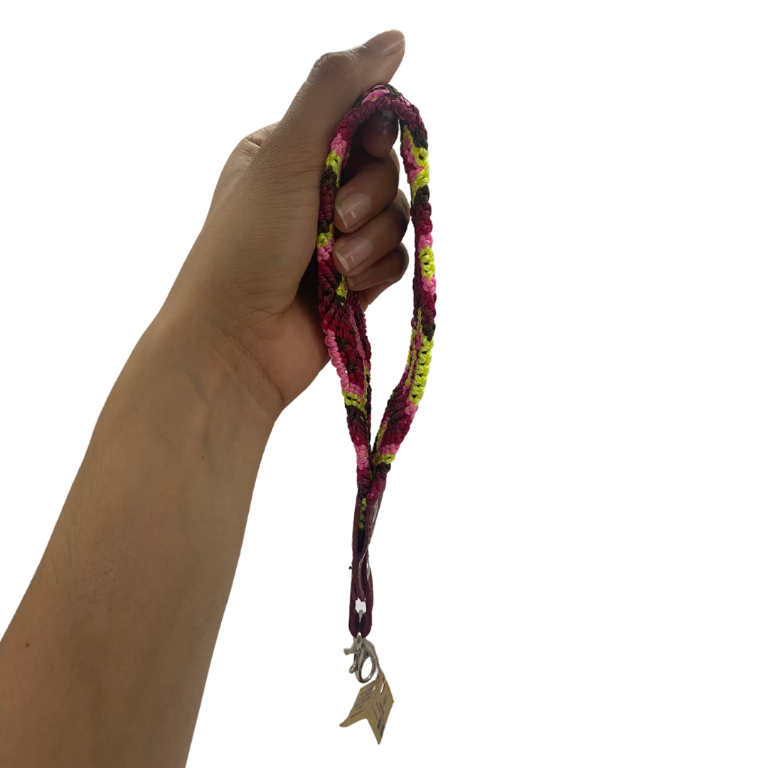 Está trenzado a mano con hilo de nylon, por artesanas de la comunidad Tzotzil en Chiapas, México. En éste trenzado vierten parte de su cultura y tradiciones, ellas escogen las combinaciones de colores y patrones, este accesorio es único y con significado. Cuenta con detalles de cuero.