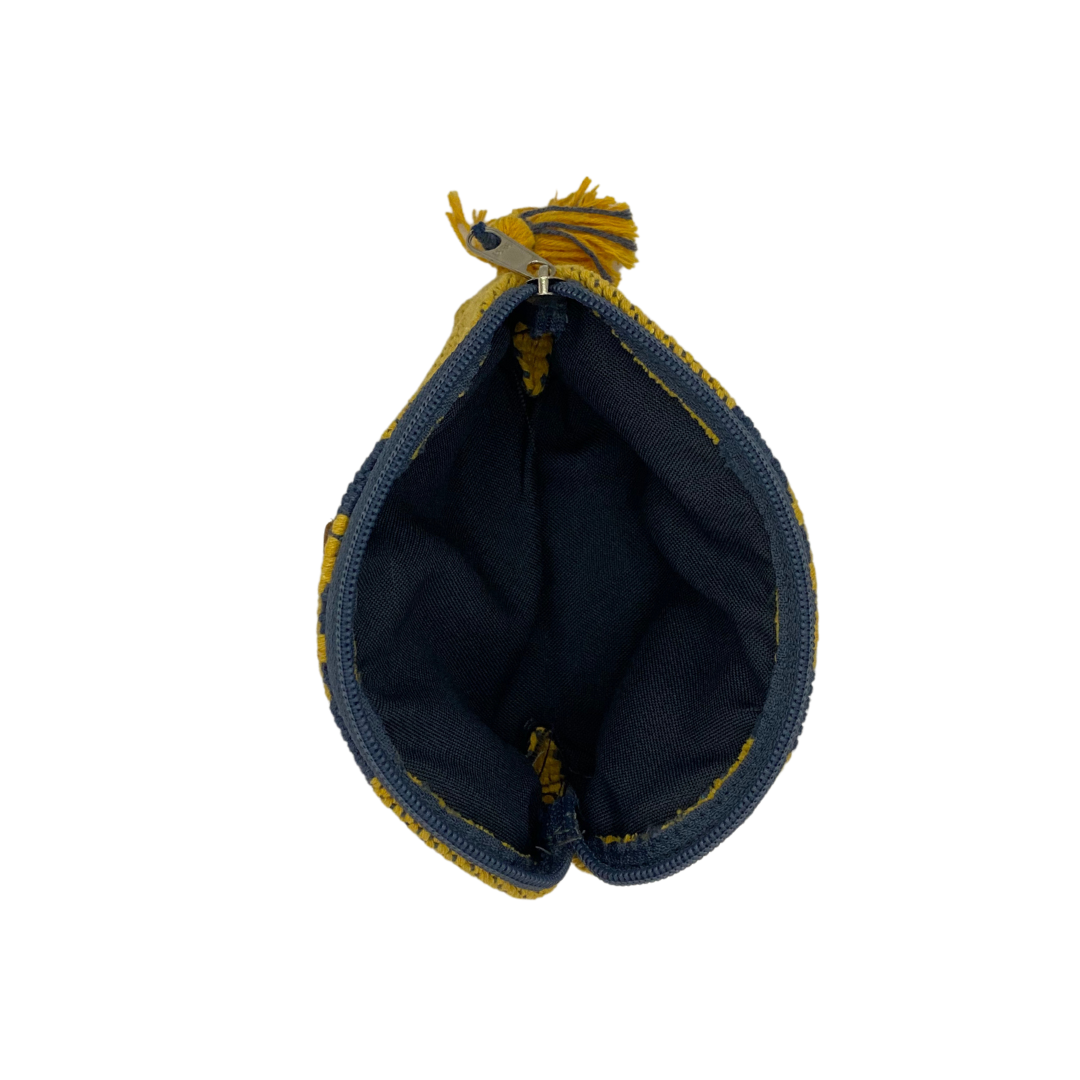La forma del monedero es ovalado, y la medida es de 15 cm de ancho x 10 cm de alto.