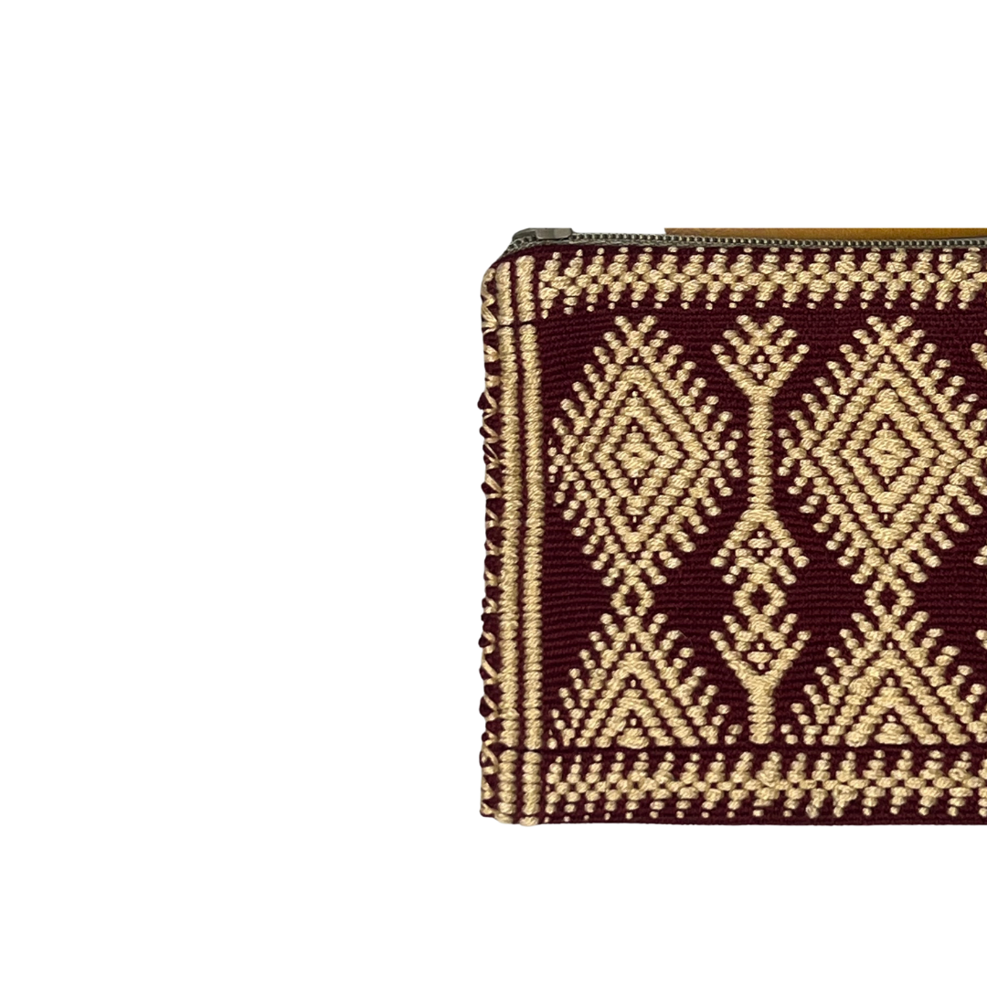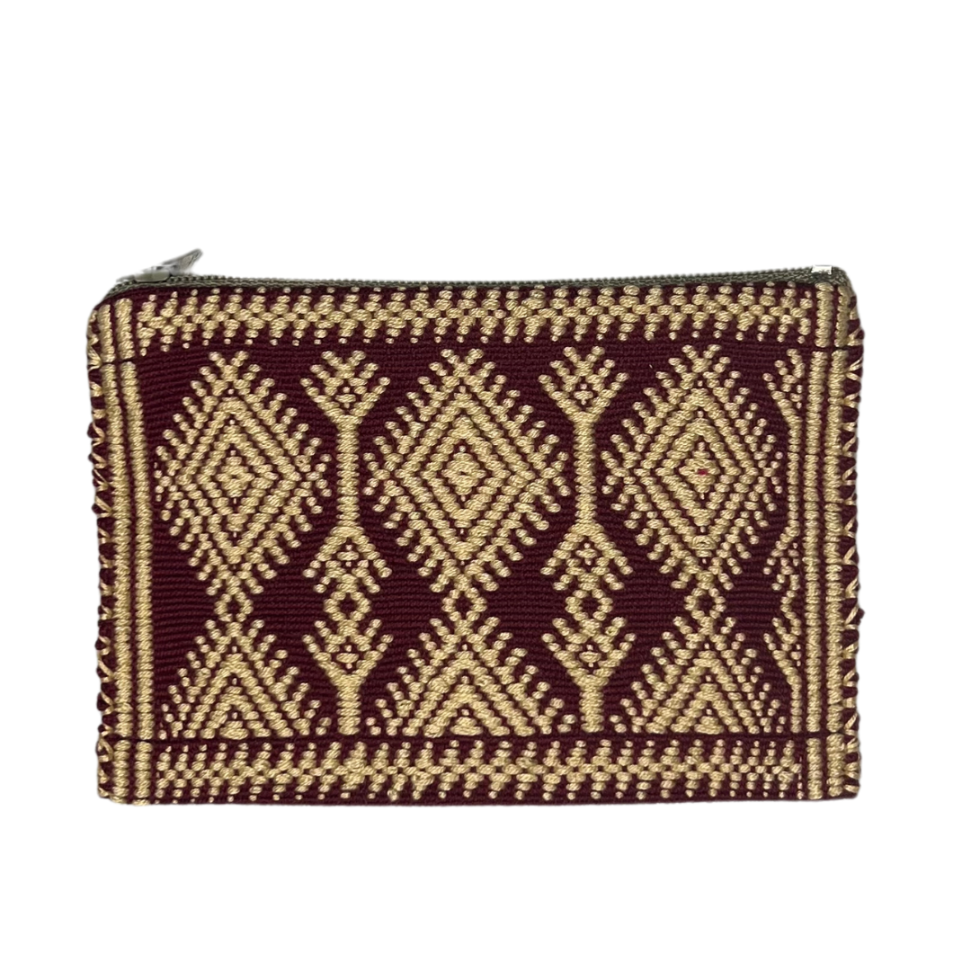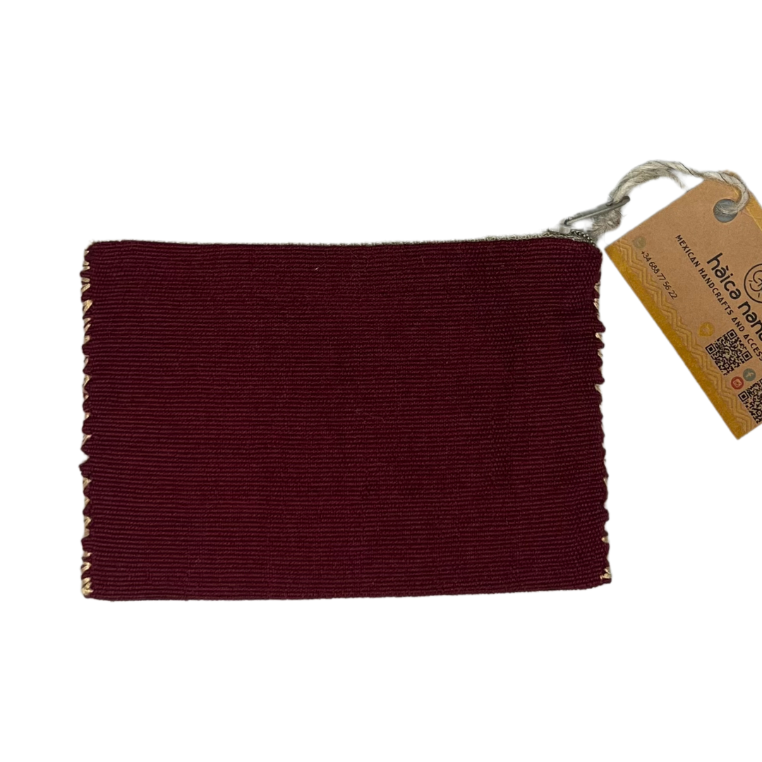 Monedero elaborado a mano por la comunidad Tzotzil en Chiapas, México. Realizado a partir de la técnica de telar de cintura, en la cual vierten elementos mayas propios de su cultura ancestral, donde se aprecian patrones que se convierten en figuras típicas de la comunidad Tzotzil. Tejido externo frontal y tejido de color sólido por la vista trasera.