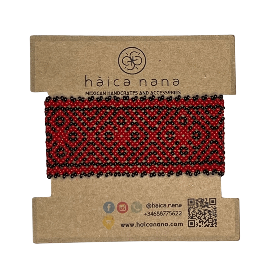 Pulsera artesanal, hecha a mano por artesanos de la comunidad Wixárika en México. Trabajo laborioso con mensajes característicos y espirituales de su cultura, en cada una de las piezas elaboradas.